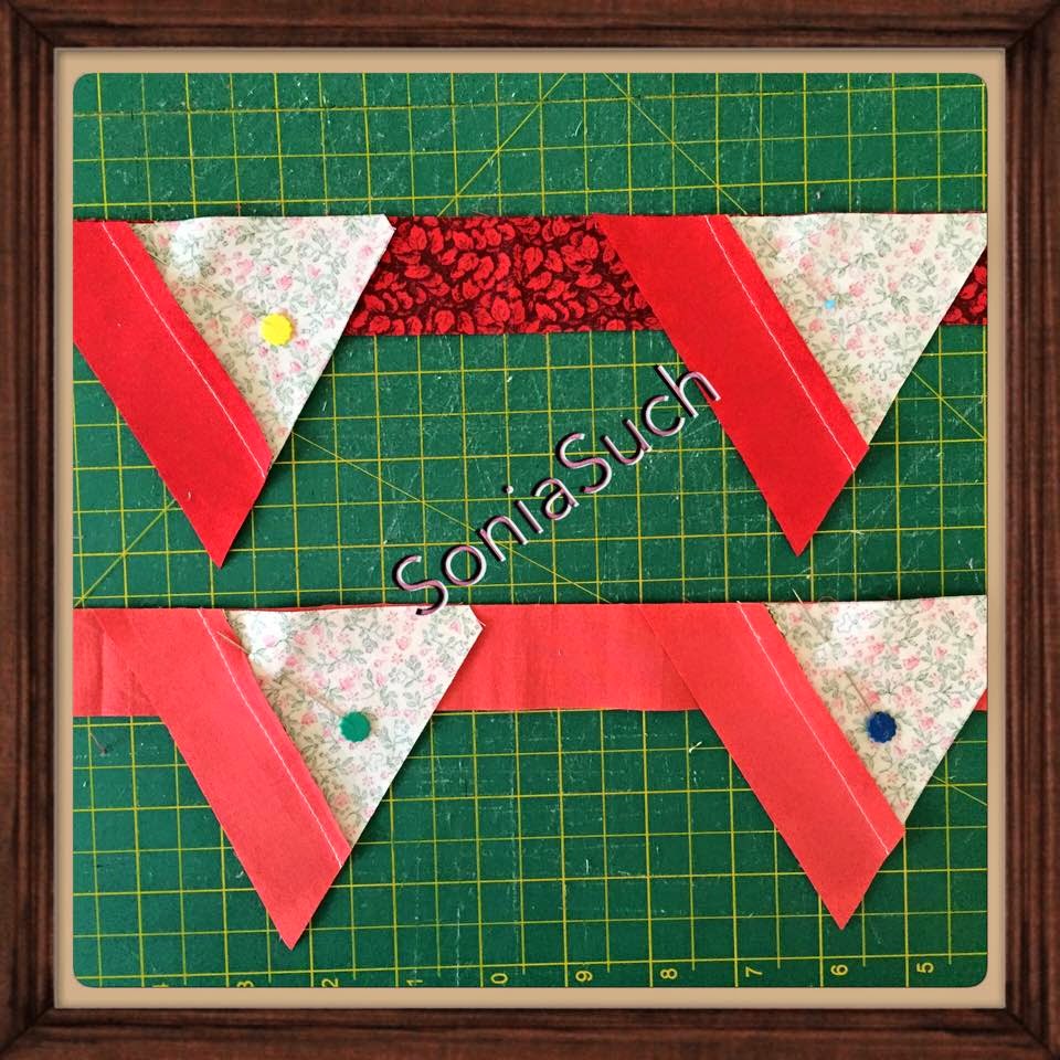 Para formar a base de quatro triângulos, usei faixas de 8 cm de largura, e cortei em ângulo de 45 graus no lado esquerdo. No lado direito, com um quadrado de 8 cm em cor contrastante (usei verde) formar uma diagonal - costurei na diagonal - 45 graus, e mais uma costura pra quando refilar aproveitar os quadradinhos. Fazer quatro para cada bloco.